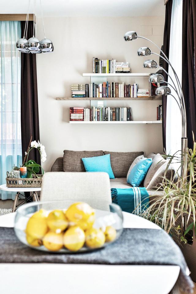 造型優(yōu)美的鐵藝落地?zé)粼诳蛷d的角落探出身子,方便了主人坐在沙發(fā)上看報。一面墻壁上用擱板打造的墻體書架,給室內(nèi)帶來文學(xué)氣息。