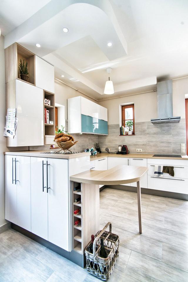 廚房的凹凸不平的天花設(shè)計,利用其特有的結(jié)構(gòu)在突出的部位裝飾幾個筒燈,體現(xiàn)出一種美感。吧臺柜旁一個小型木質(zhì)酒柜設(shè)計,是一大創(chuàng)意,增加了收納空間。(相關(guān)閱讀:華埔裝飾水電工程是這樣驗收的)