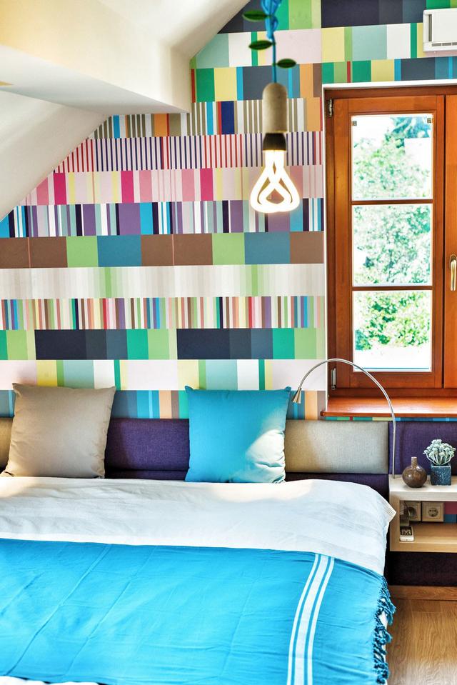 臥室墻壁采用色彩繽紛的壁紙進行裝飾,讓整面墻煥發(fā)活力,頂部的燈飾用樹葉型燈線進行設(shè)計,也讓清新的感覺一觸即發(fā)。