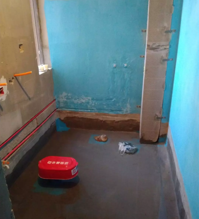 (注:華埔裝飾工地衛(wèi)生間要求做統(tǒng)一的防水施工工藝,墻面涂刷公司標(biāo)準(zhǔn)藍色防水,地面使用丙綸防水材料施工。)