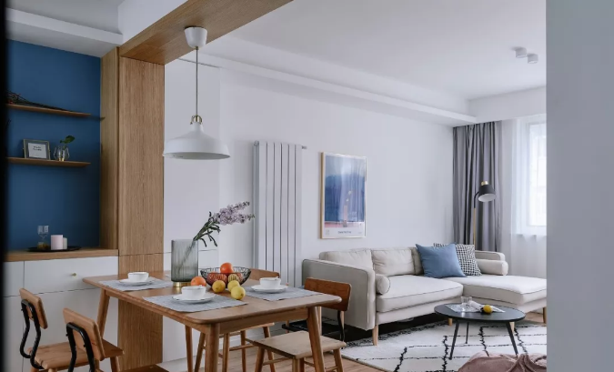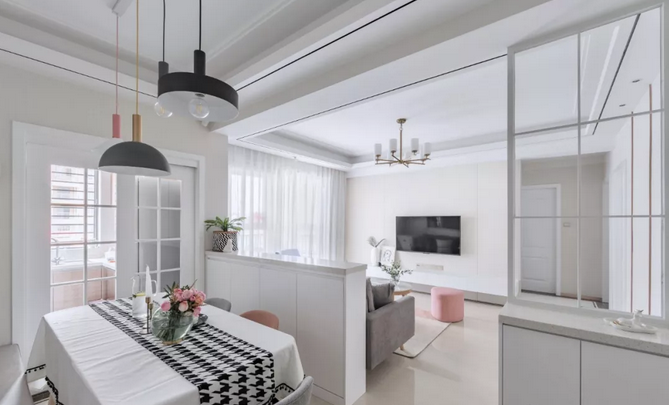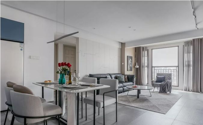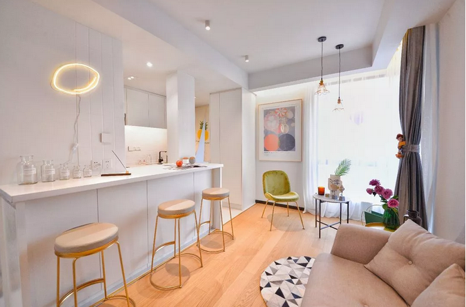 墻體打掉后,開放式格局能最大化引入光線,巧妙利用軟隔斷也可以自然分區(qū),廚房和餐廳用島臺或吧臺,客廳和餐廳之間用不同的墻面色或地毯,客廳和陽臺之間用木地板和地磚區(qū)分。
